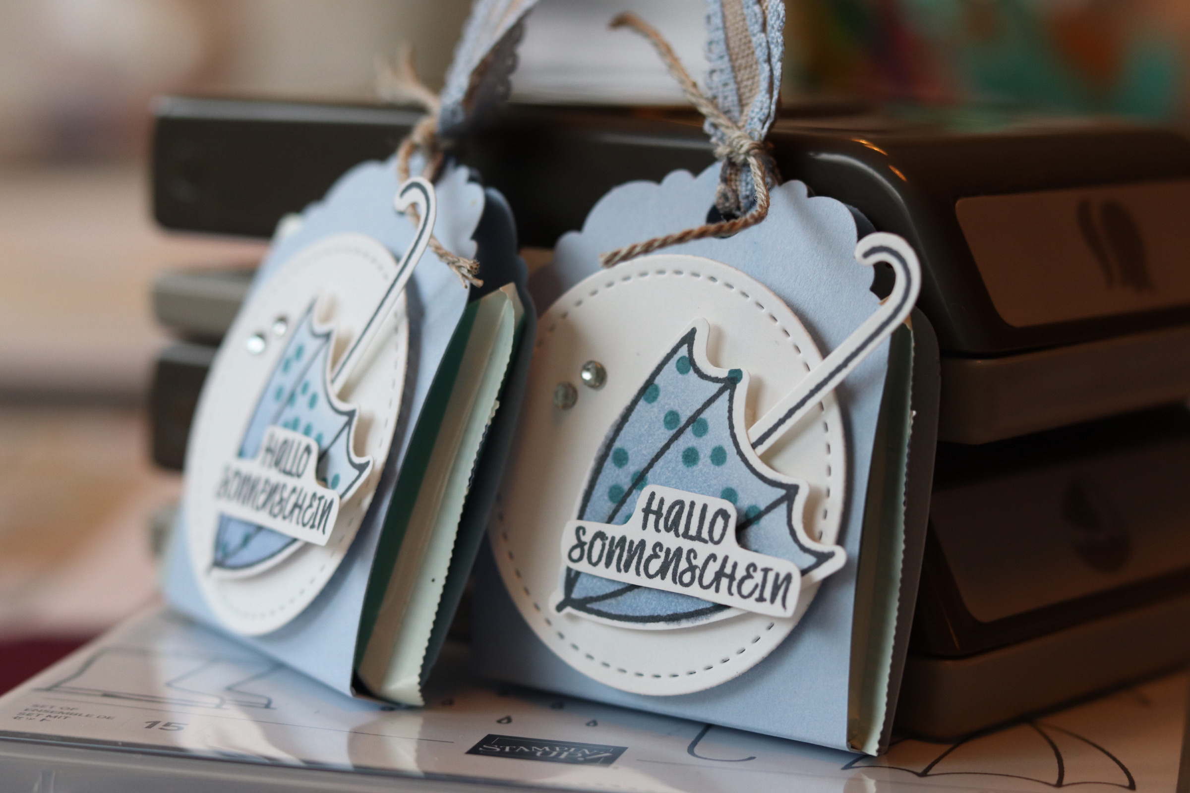 Die Dekoration besteht aus einem der Kreise aus den Stanzformen „Stickereien“ und dem Motiv und dem Spruch aus dem Stempelset „Glücksregen“, den zusammengeklappten Schirm habe ich in Memento Schwarz gestempelt und mit den Blends in Rauchblau koloriert.