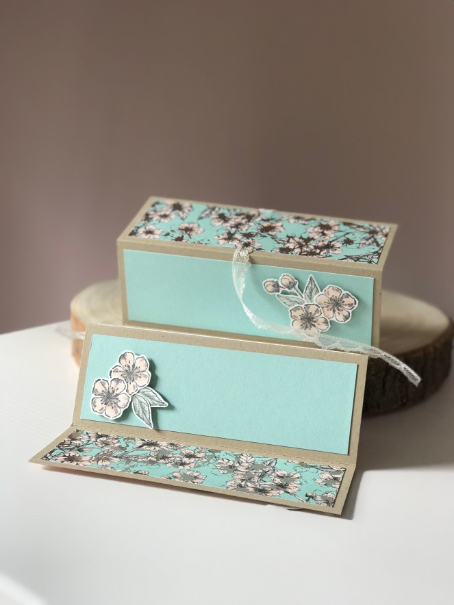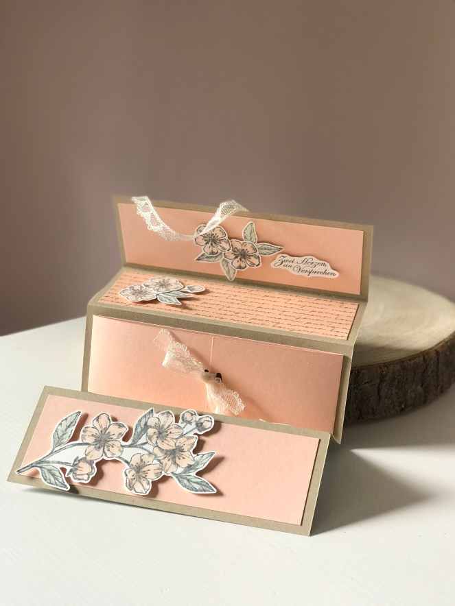 Zum Projekt: Ich persönliche liebe Mini-Alben und halte sie für eine tolle Geschenkidee für persönliche Dinge wie Fotos oder Zeit-zu-zweit-Gutscheine. (Spoileralarm: Dazu zeige ich euch diese Woche noch etwas.) Es gibt sie in allen Größen, Formen und Farben und ich habe mich für eine längliche Variante entschieden, die ich bei „Zauberhaft Handgemacht“ entdeckt und versucht habe, sie mit unseren Stampin‘ Up! Produkten aus dem Mini Katalog Januar bis Juni 2020 umzusetzen. Dabei habe ich mich für das Besondere Designerpapier Frühling in Paris und das Stempelset „Ewige Blüten“ entschieden, das mit pastelligen Tönen besticht und seine Besonderheit in dem Champagnerfarbenen glänzenden Details hat. Das aufgeklappte Album seht hier hier: