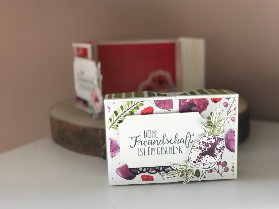 Nun aber zu meiner Split Top Box. Ich habe im Anleitungsvideo ein etwas anderes Design gewählt, vielleicht ein Grund, auch noch einmal hier hineinzuschauen, wenn ihr schon dabei wart. Außerdem seht ihr im Video auch den Specht, der mich beim Basteln etwas abgelenkt hat. 🙂 Die Materialliste und eine Skizze findet ihr übrigens in diesem Beitrag.