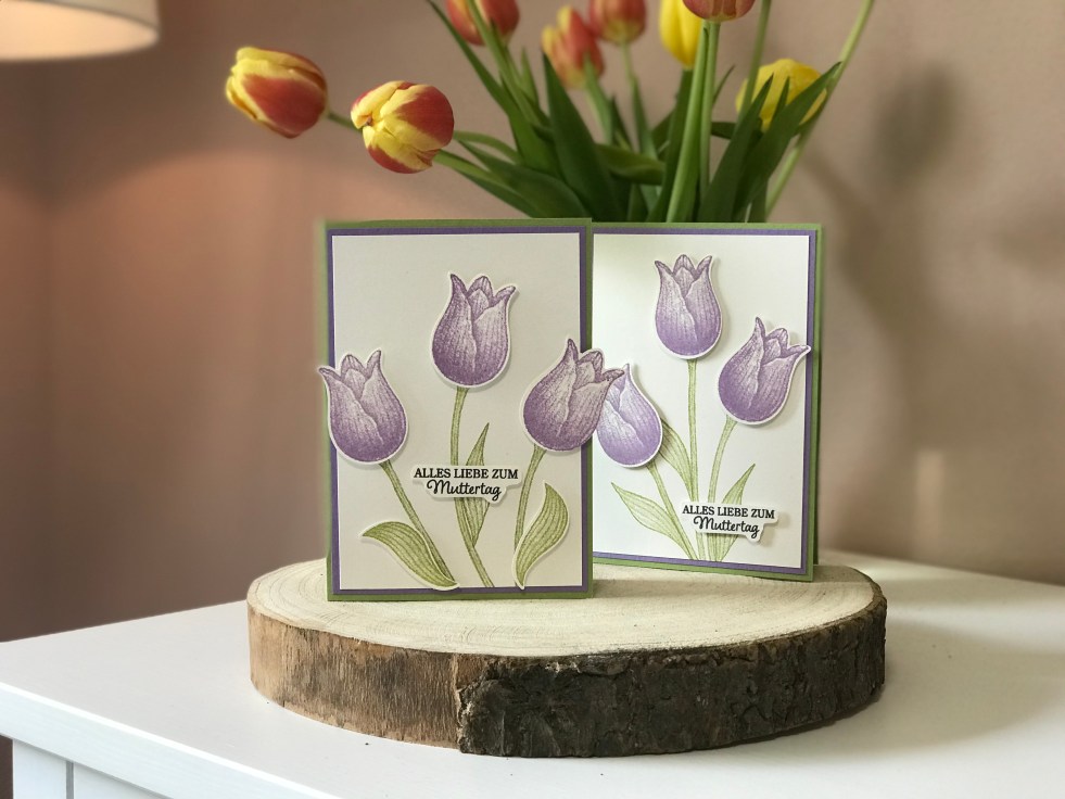 Im Video zeige ich euch die Schablonentechnik sowohl mit als auch ohne den Stamparatus, das Video ist also für jeden was. Ich hoffe, dass ihr es damit leichter haben werdet, eure Elementstanzen zu benutzen und dass es vielleicht dem ein oder anderen unter euch wie Schuppen von den Augen fällt 😉 Mein Erlebnis, als ich diese Technik gezeigt bekommen habe, beschreibe ich wie folgt: Ein inneres Wesen, dass sich in meinem Gehirn befindet, schlug sich geräuschvoll vor den Kopf und sagte „Wir waren Idioten. Die ganze Zeit über!“ 😀 Ich präsentiere also diese tolle Stempeltechnik und vor allem einen meiner Lieblinge aus dem aktuellen Mini-Katalog (und dem neuen Hauptkatalog) : Das Produktpaket Tulpengrüße mit passender Elementstanze!
