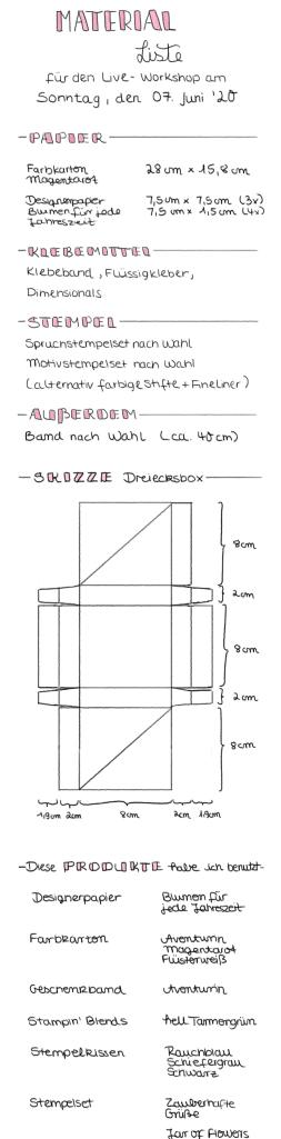 Wie immer gibt es für euch eine Materialliste sowie eine Skizze der Box, damit ihr euch auf den LiveWorkshop vorbereiten könnt und eine Sicherheit zur Hand habt, falls ihr im Video nicht mitkommt oder den Faden verliert.