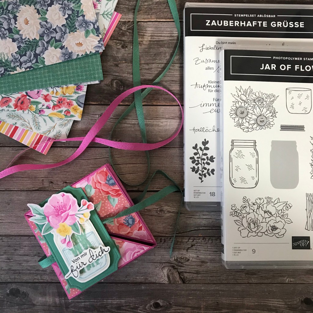 Natürlich kommen bei diesem Projekt tolle Produkte aus dem neuen Katalog zum Einsatz! Ich zeige euch hier, was man mit dem Stempelset Jar of Flowers und dem Set Zauberhafte Grüße alles machen kann, vor allem zeige ich auch aber, was mit dem mega Designerpapier Blumen für jede Jahreszeit möglich ist. Alle fünf InColors sind darin vertreten, das macht es perfekt für Einsteiger 😍