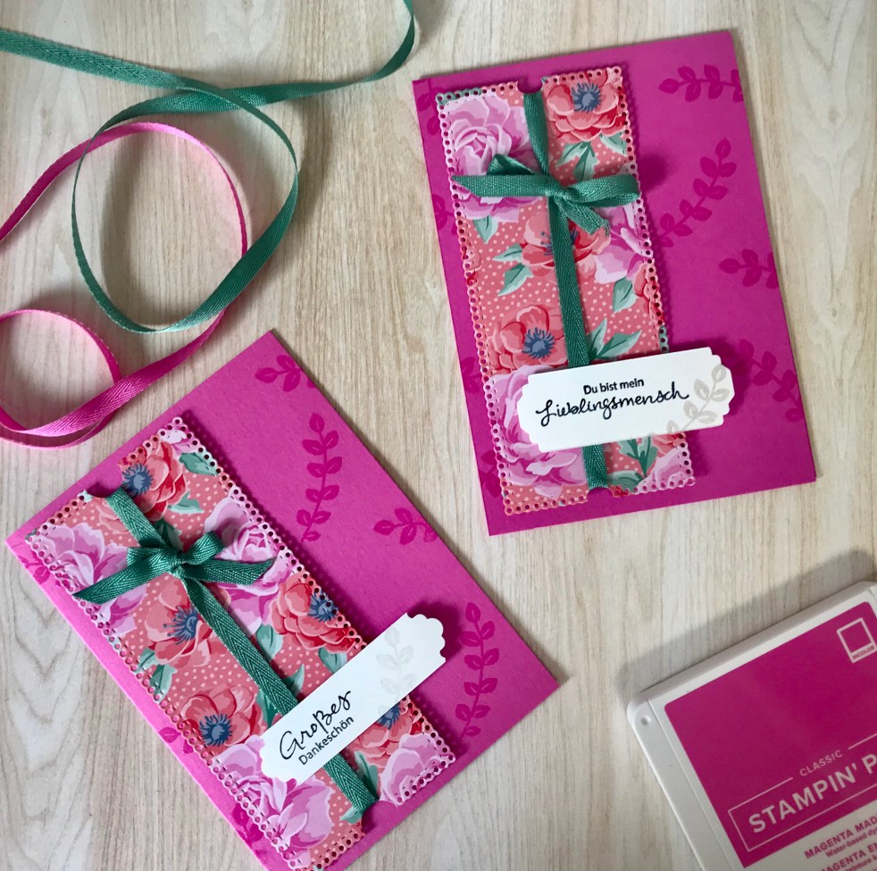 Im Video zeige ich euch Schritt für Schritt die Karte in Magentarot zusammen mit dem wunderschönen Designerpapier „Blumen für jede Jahreszeit„, die Verpackung dazu habe ich euch vor zwei Wochen im Online Bastelworkshop gezeigt. Wenn ihr also ein Geschenkset basteln wollt, dann seid ihr bei diesen beiden Anleitungen genau richtig!