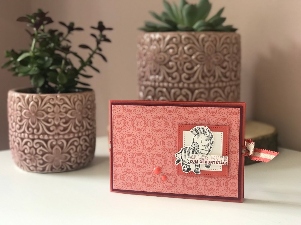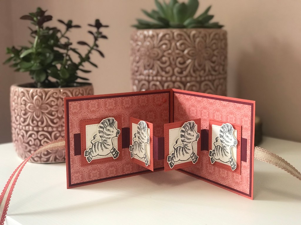 Von vorne sieht sie aus, wie eine ganz normale Karte, aber der Teufel steckt hier eindeutig im Detail, ähm… ich meine das Zebra! Denn wenn ihr die Karte öffnet, könnt ihr diesen tollen Faltmechanismus sehen, Je nachdem, welches Motiv ihr auswählt, könnt ihr damit eine ganze Geschichte erzählen. Ich kann mir die Karte auch super gut als Gutscheingeschenk vorstellen, bei dem ihr in jedes Quadrat etwas hineinschreiben könnt 🙂 Ich habe mich bei meinem Projekt für das Stempelset Zany Zebras entschieden, was ich wirklich unschlagbar niedlich finde! Weil ich Sprüche auf deutsch haben wollte, habe ich mich für die Prima Pärchen entschieden. Alle anderen Produkte, die ich hier benutzt habe, findet ihr unter der Materialliste.