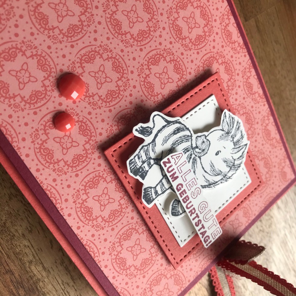 Von vorne sieht sie aus, wie eine ganz normale Karte, aber der Teufel steckt hier eindeutig im Detail, ähm… ich meine das Zebra! Denn wenn ihr die Karte öffnet, könnt ihr diesen tollen Faltmechanismus sehen, Je nachdem, welches Motiv ihr auswählt, könnt ihr damit eine ganze Geschichte erzählen. Ich kann mir die Karte auch super gut als Gutscheingeschenk vorstellen, bei dem ihr in jedes Quadrat etwas hineinschreiben könnt 🙂 Ich habe mich bei meinem Projekt für das Stempelset Zany Zebras entschieden, was ich wirklich unschlagbar niedlich finde! Weil ich Sprüche auf deutsch haben wollte, habe ich mich für die Prima Pärchen entschieden. Alle anderen Produkte, die ich hier benutzt habe, findet ihr unter der Materialliste.