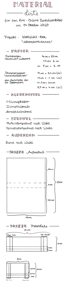 Wenn ihr das Projekt original so mitbasteln möchtet, dann habe ich euch eine Produktliste unter die Skizze geschrieben, darauf kommt es bei dieser Art meiner Workshops aber überhaupt nicht an. Wichtig ist, dass ihr beim Basteln Spaß habt und ein Projekt dabei herauskommt, das euch gut gefällt.