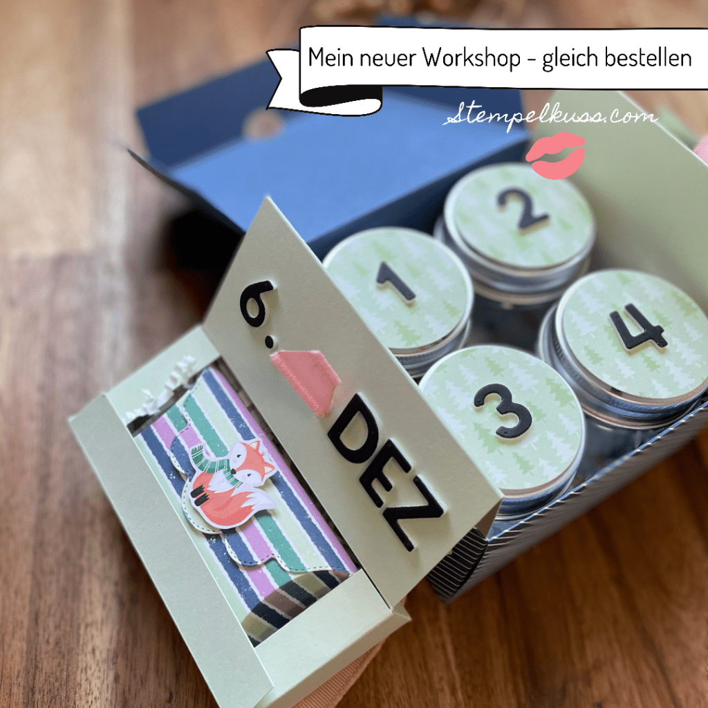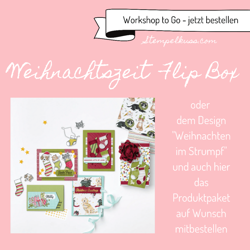 ich möchte euch heute meinen neuen Workshop (to Go) vorstellen: Die Weihnachtszeit Flip Box! Du entscheidest ganz nach deinen Bedürfnissen, ob du beim Workshop in Präsenz teilnehmen willst (noch 4 Plätze frei), dir den Workshop to Go mit allen Materialien nach Hause zum selbst Basteln bestellst oder einfach nur die Videoanleitung orderst.