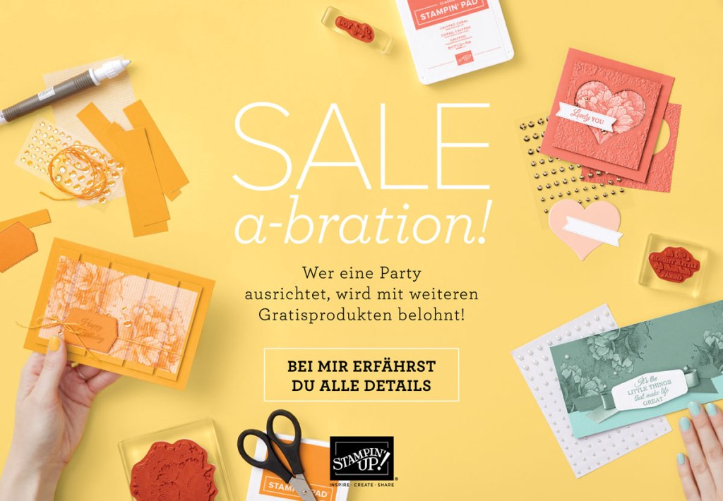 Bei der Sale-a-Bration erhältst du für jede Bestellung ein Gratisprodukt, wenn sie den Bestellwert (ohne Versand gerechnet) von 60€ hat. Für jede weiteren 60€, die du in deiner Bestellung ausgibst, erhältst du ein weiteres Gratisprodukt geschenkt. Das macht also: 120€ gleich zwei Geschenke, 180€ drei Geschenke und so weiter – völlig ohne Haken! Wenn dir ein Produkt (zum Beispiel Designerpapier) so gut gefällt, dass du Angst hast, es könnte dir ausgehen, kannst du auch mehrere davon bestellen 🙂