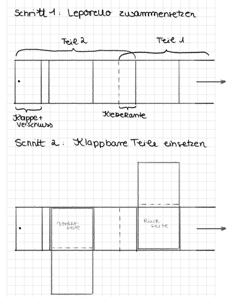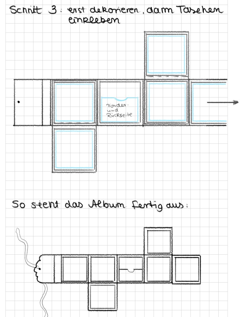Diese Zeichnung wird euch helfen, das Leporello an der Klebelasche zusammenzusetzen. Keine Sorge, die verschwindet hinterher hinter dem Designerpapier.