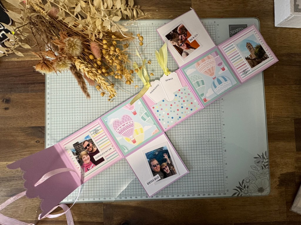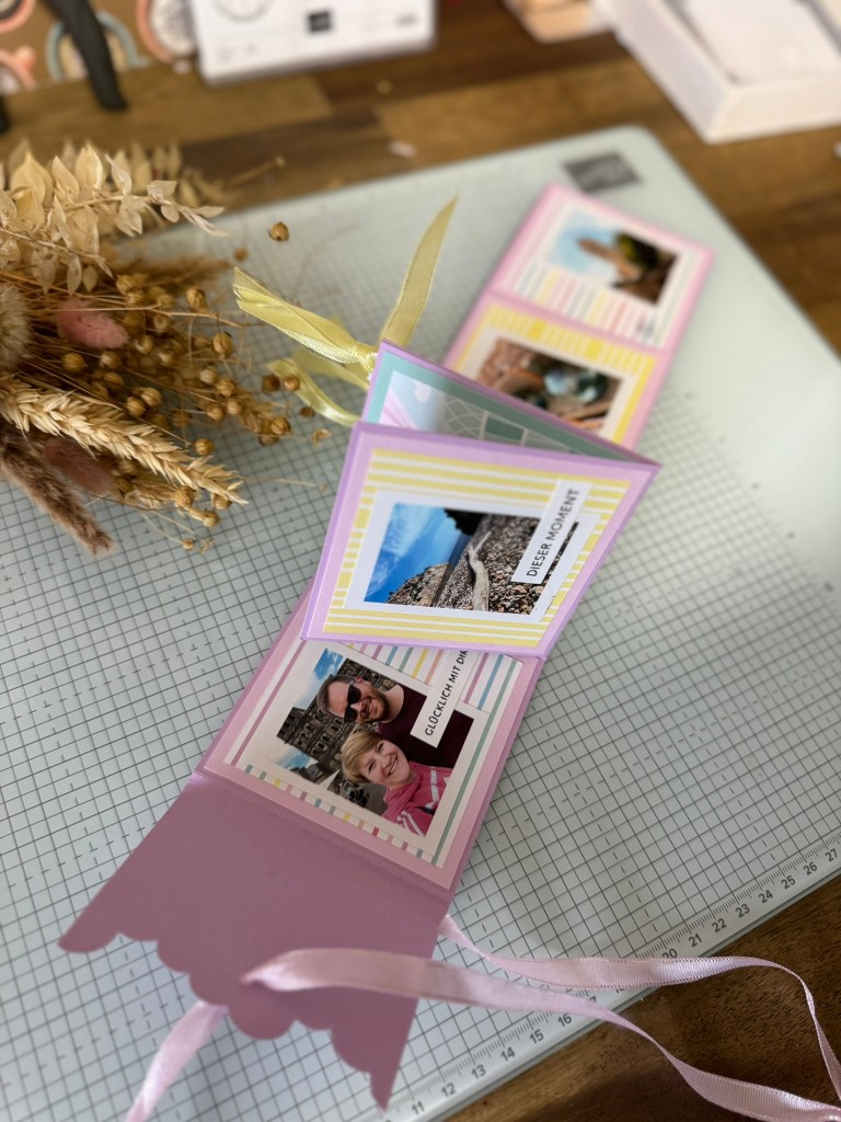 heute zeige ich euch, wie dieses süße Leporello gebastelt wird. Wir haben es in der Bücherei zusammen gebastelt als Erinnerungsbuch für Mini-Fotos. Man kann aber auch super einen Gutschein daraus machen oder ein Geldgeschenk.