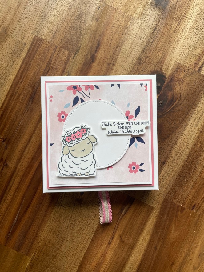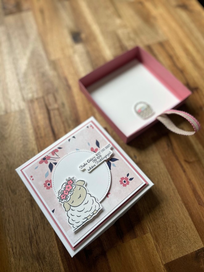Ich habe mit dem Stempelset Springtime Joy gearbeitet, eine klare Empfehlung von mir für die Ostertage, aber auch für andere Anlässe, das Schäfchen ist einfach zuckersüß! ❤ Mit dem rosa Band habe ich noch einen kleinen Mechanismus gebaut, mit dem man den Deckel etwas leichter abgezogen bekommt, alles für kleine Finger, die mit filigranem Papier nicht ganz geduldig sind. Der Spruch kommt aus einem weiteren tollen Stempelset, dass ich auch für jeden anderen Anlass empfehlen könnte: Tulpengrüße ist einfach klasse. Weil das Designerpapier schon aufgeregt genug ist, habe ich das „Topping“ absichtlich etwas schlichter gehalten und einfach einen bestickten Kreis aus den Stanzformen Stickmuster. Ein weiteres tolles Basic, dass leider den Katalog verlassen wird. Also schnell sein, wenn ihr es noch ergattern wollt, den Link zum Online Shop findet ihr hier.