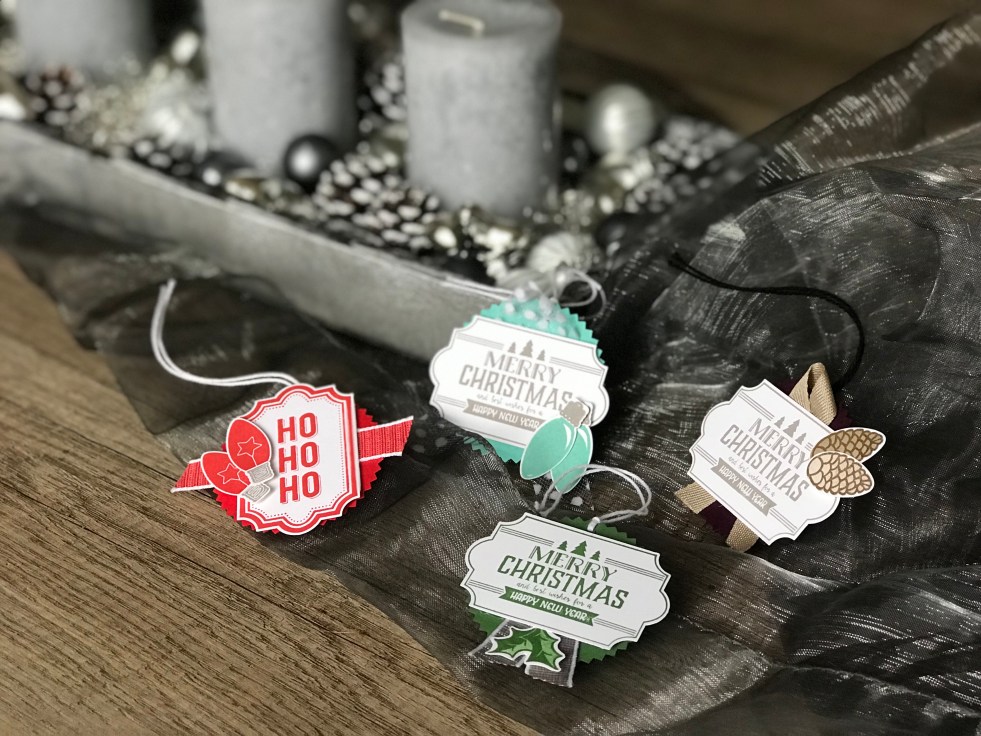 Liebe StempelfreundInnen und Stampin' Up! Interessierte, Heute zeige ich euch das zweite Weihnachtsprojekt für dieses Jahr: Meine selbstgestanzten Geschenkanhängerchen! Siebenten übrigens auch ein Projekt im letzten Bastelworkshop. Dazu braucht ihr im wesentlichen zwei Stanzen: Die "Sonne" und das "Etikett für jede Gelegenheit". Mit der Sonne habe ich vier verschiedenfarbige Kartons gestanzt, Jade, Blutorange, Gartengrün und… Weiterlesen 2nd Day of Christmas