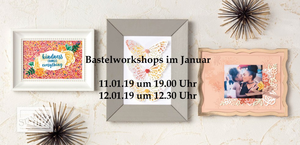 Liebe StempelfreundInnen und Stampin' Up! Interessierte, ich lade euch ganz herzlich zu den nächsten beiden Bastelworkshops ein, bei denen ihr die Gelegenheit habt, mit den brandneuen Produkten aus dem Frühjahrs-/Sommerkatalog zu basteln, die es ab Januar zu bestellen geben wird! Eure Kataloge werde ich euch im Laufe des Monats schon vorbeischicken 🙂 Wir basteln gemeinsam… Weiterlesen Bastelworkshops im Januar