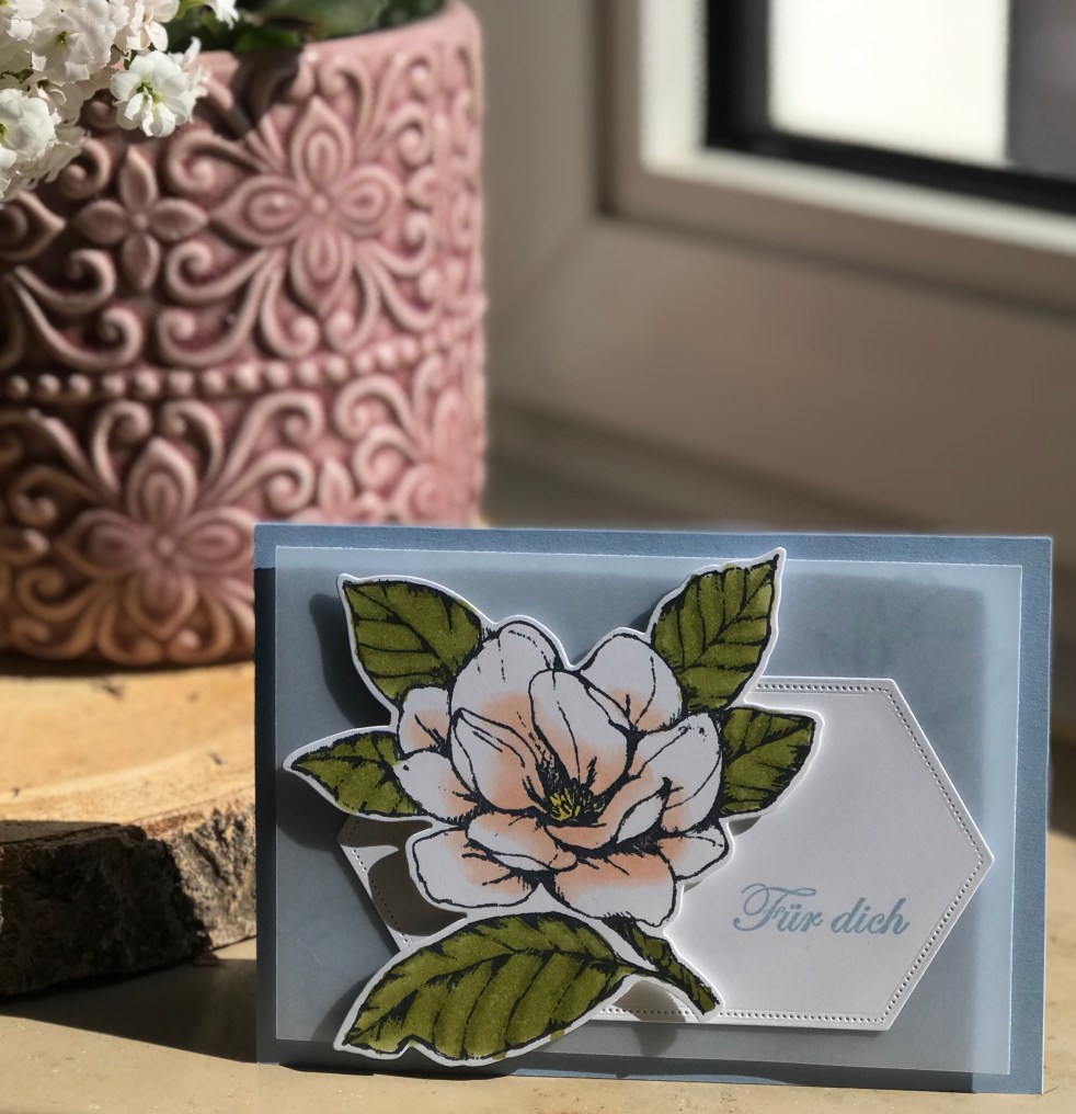 Liebe StempelfreundInnen und Stampin' Up! Interessierte, Da ist das erste Projekt mit den brandneuen Produkten aus dem Jahreshauptkatalog! Ich bin ganz besonders verliebt in den Magnoliengruß, ein wunderhübsches Stempelset, von dem ich euch im letzten Blogeintrag erzählt habe. Ich habe fleißig mit den Blends koloriert und die Magnolie zum Mittelpunkt meiner ersten Karte in der… Weiterlesen Magnolienzauber in Rauchblau