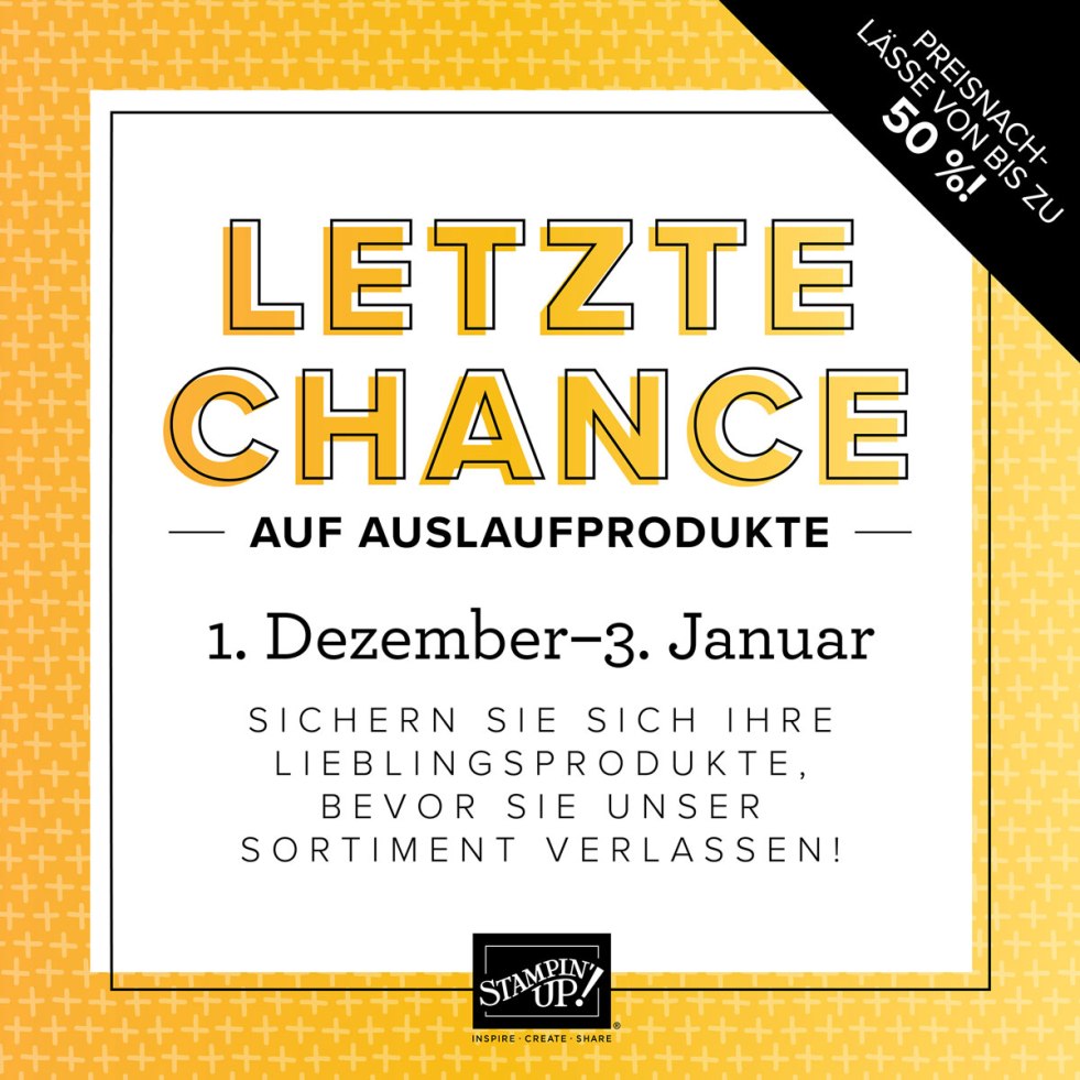Liebe Stempelfreund*innen und Stampin' Up! Interessierte, es ist soweit, der neue Katalog steht in den Startlöchern, der alte muss gehen. Aber seid nicht allzu traurig, sondern freut euch auf satte Rabatte zum Katalogausverkauf.Hier findet ihr die Liste mit allen Produkten, die das Sortiment verlassen werden und welche davon rabattiert sind: Hier findest du die ListeHerunterladen… Weiterlesen Letzte Chance auf Auslaufprodukte – bis zu 50% Rabatt