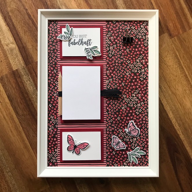 Inspiriert durch meine liebe Teamkollegin Elke, mit der ich mich in diesem Jahr so wunderbar austauschen durfte, gibt es diesen tollen Workshop im Januar: Ein Memoboard für euren Lieblingsraum zum Verschenken oder selber Behalten 😉 mit Notizblock, Stift, selbstgestempelter Motivationsnachricht, Schlüsselhalter und Magnet für Dinge, die aufbewahrt werden müssen, das Ganze in DinA4, wie immer mit allem drum und dran und deiner persönlichen Anleitung als Video (Preis inkl. Versand 21€)